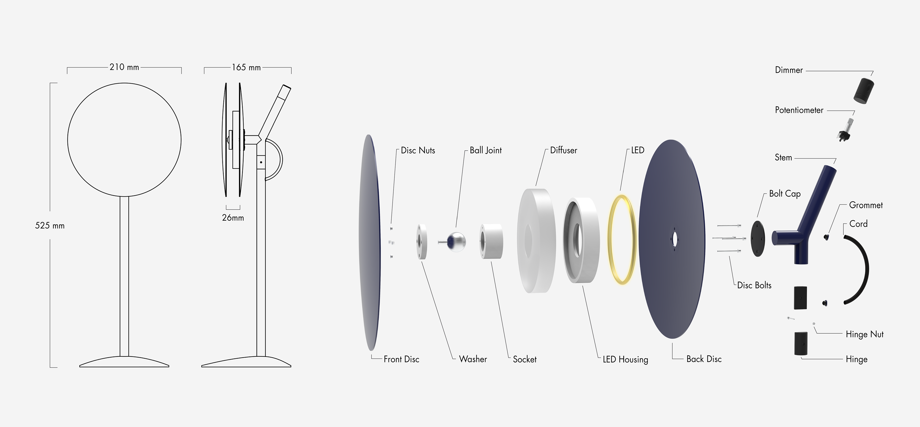 Lune is a task lamp that integrates functionality and elegance, inviting a tactile exploration of light and transforming spaces with ambient and versatile illumination. The design plays upon the forms and movements reminiscent of the moon. Composed of bold geometric shapes and delicate detailing, Lune presents a graphic and sculptural silhouette. Its singular colour unifies the form, drawing focus to these defining elements. A light source housed between two discs casts a band of light throughout the room. The subtitle tension between the discs captivates the user, evoking a desire to touch; pinch; twist; tilt.